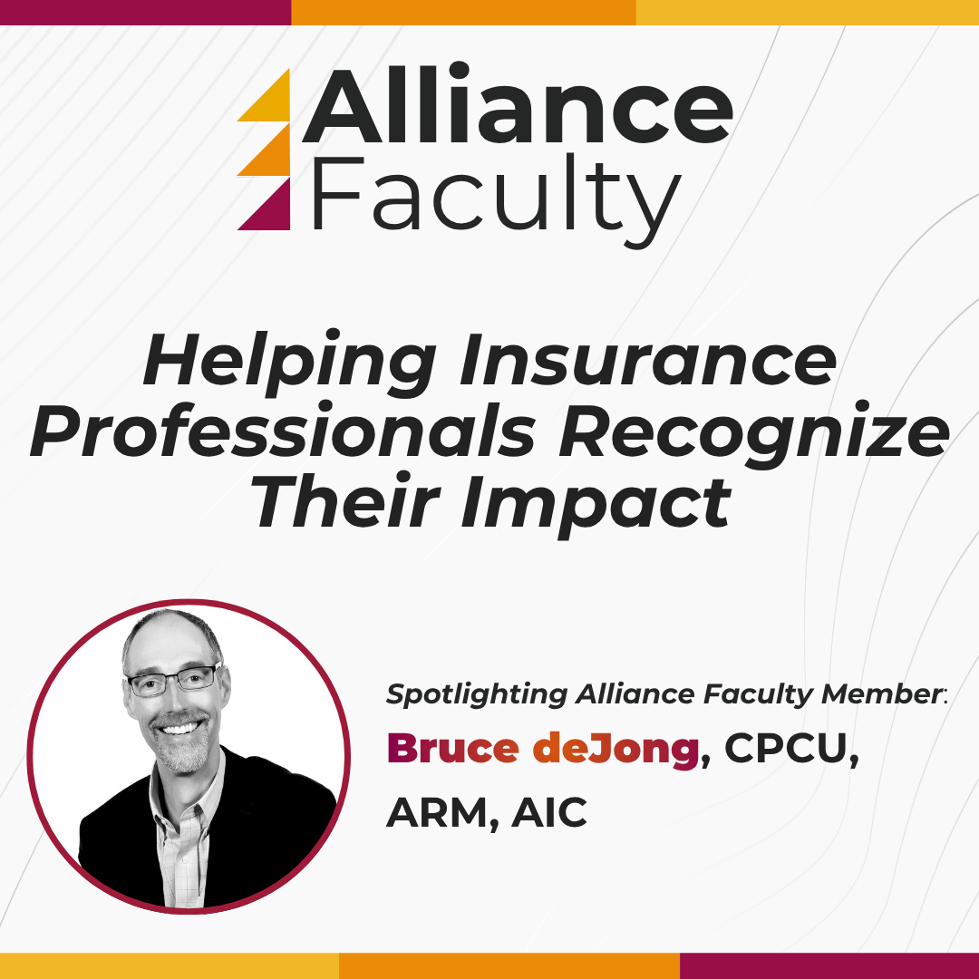 In addition to his role at Mutual of Enumclaw, Bruce serves as a curriculum development advisor for the CIC program and has been teaching with The Alliance since 2018. He also provides continuing education classes for Mutual of Enumclaw’s agents and is a keynote speaker and instructor for organizations such as the National Association of Mutual Insurance Companies and the Property Loss Research Bureau. Furthermore, Bruce is a leadership coach who helps employees have a fulfilling insurance career by identifying and aligning their strengths to overcome self-limiting beliefs.