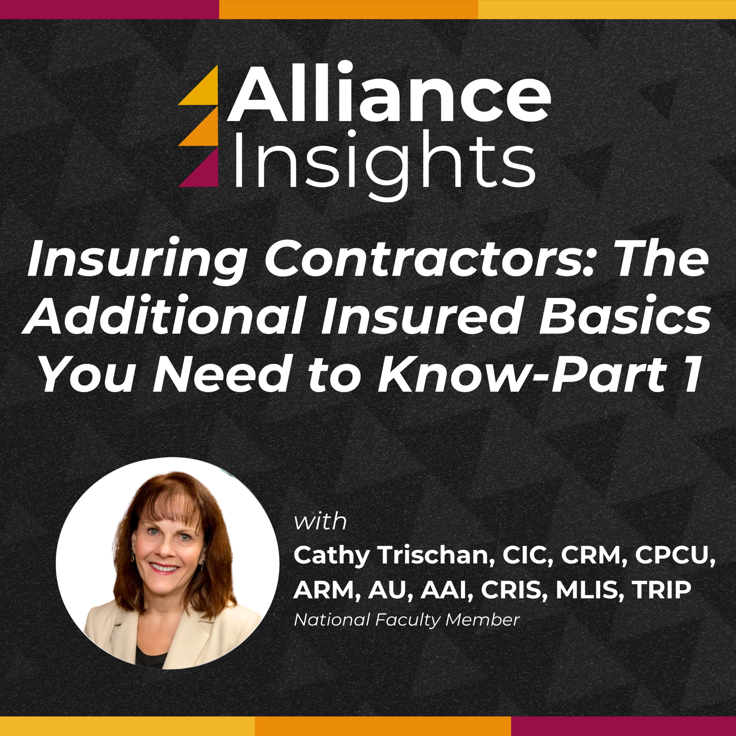 In this informative episode of Alliance Insights, host Noelle Codispoti is joined by Alliance faculty member and insurance industry expert Cathy Trischan for Part I of a deep dive into one of the most complex topics in commercial insurance: additional insured coverage for contractors.