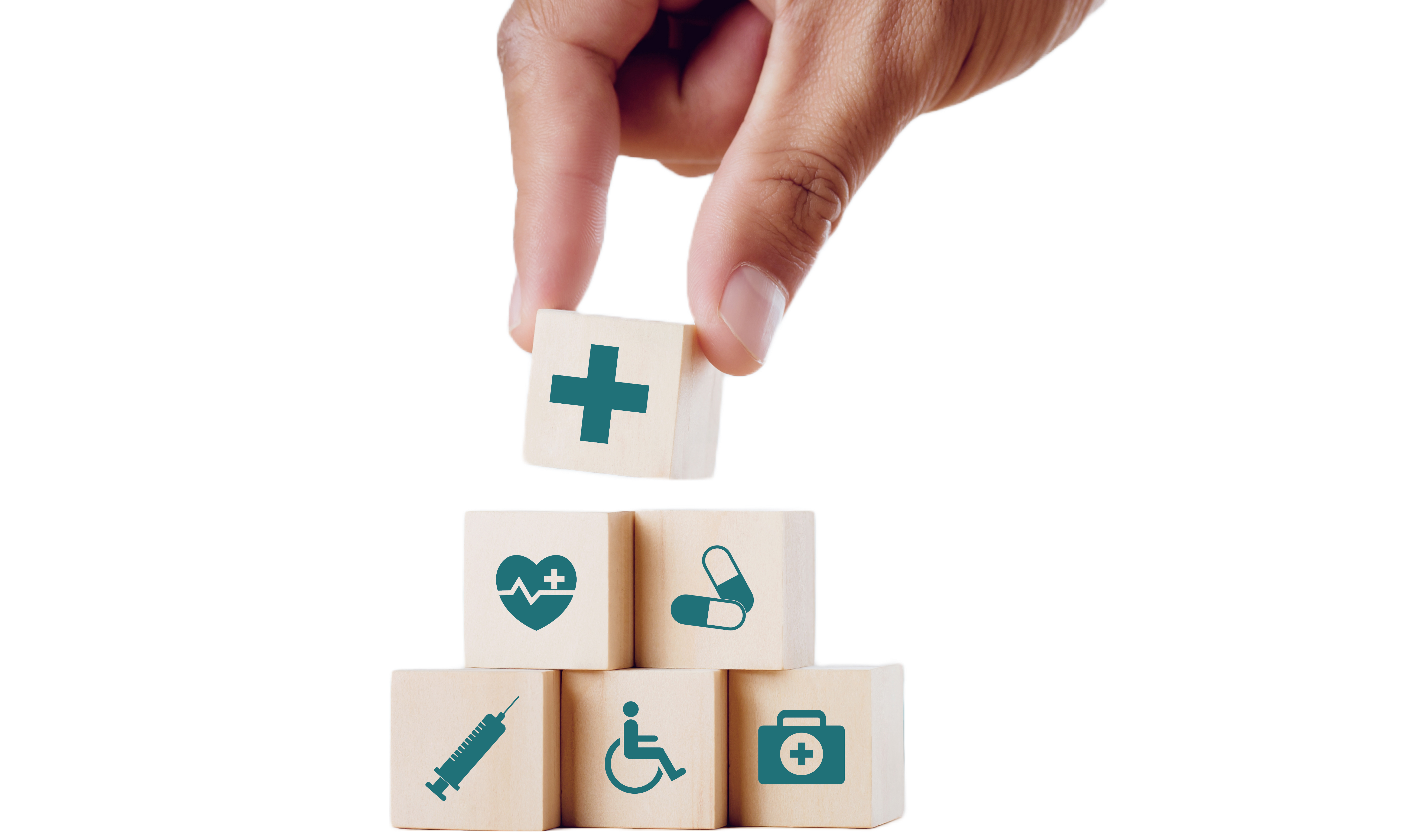 Hand reaching down from out of frame, placing a building block with a Healthcare Plus icon on top; placing the block on a stack of other blocks with various insurance related icons.